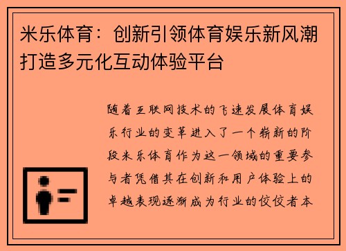 米乐体育:创新引领体育娱乐新风潮打造多元化互动体验平台