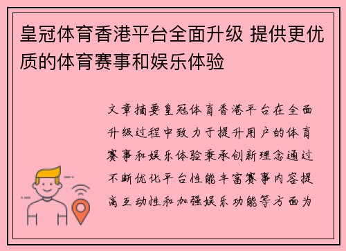 皇冠体育香港平台全面升级 提供更优质的体育赛事和娱乐体验